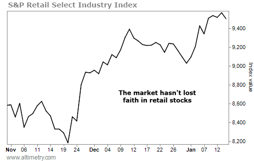 We're already seeing some signs of this mini-retail rally. The S&P Retail Select Industry Index – which tracks companies ranging from e-commerce shops to wholesalers, makeup retailers, and auto dealers – is up more than 5% to start the year.