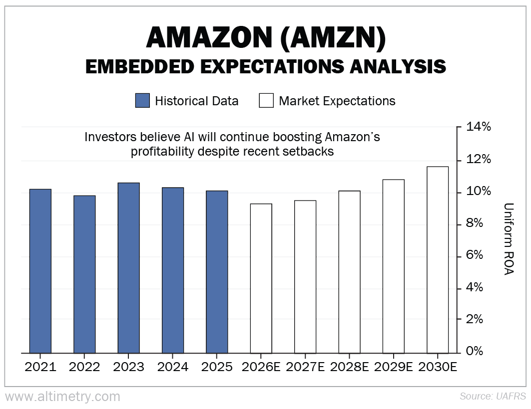 Now that Amazon has grown into an AI and data infrastructure leader, investors' expectations are rising. They think its Uniform ROA will reach nearly 12% (the U.S. corporate average) in the next five years. Take a look...