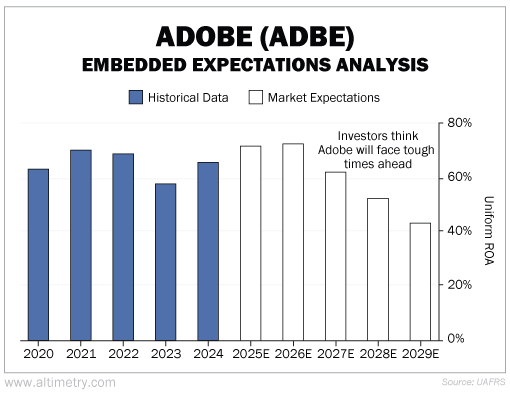 The EEA works a lot like a betting line in a sports bet... We use Adobe's current share price to calculate what investors expect from future performance and compare those forecasts with our own.