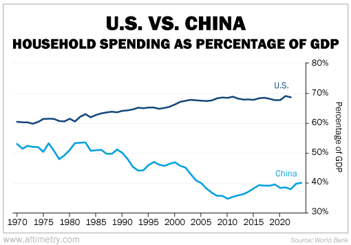 Just take a look at the chart below. It shows the difference between Chinese and American household spending as a percentage of GDP.