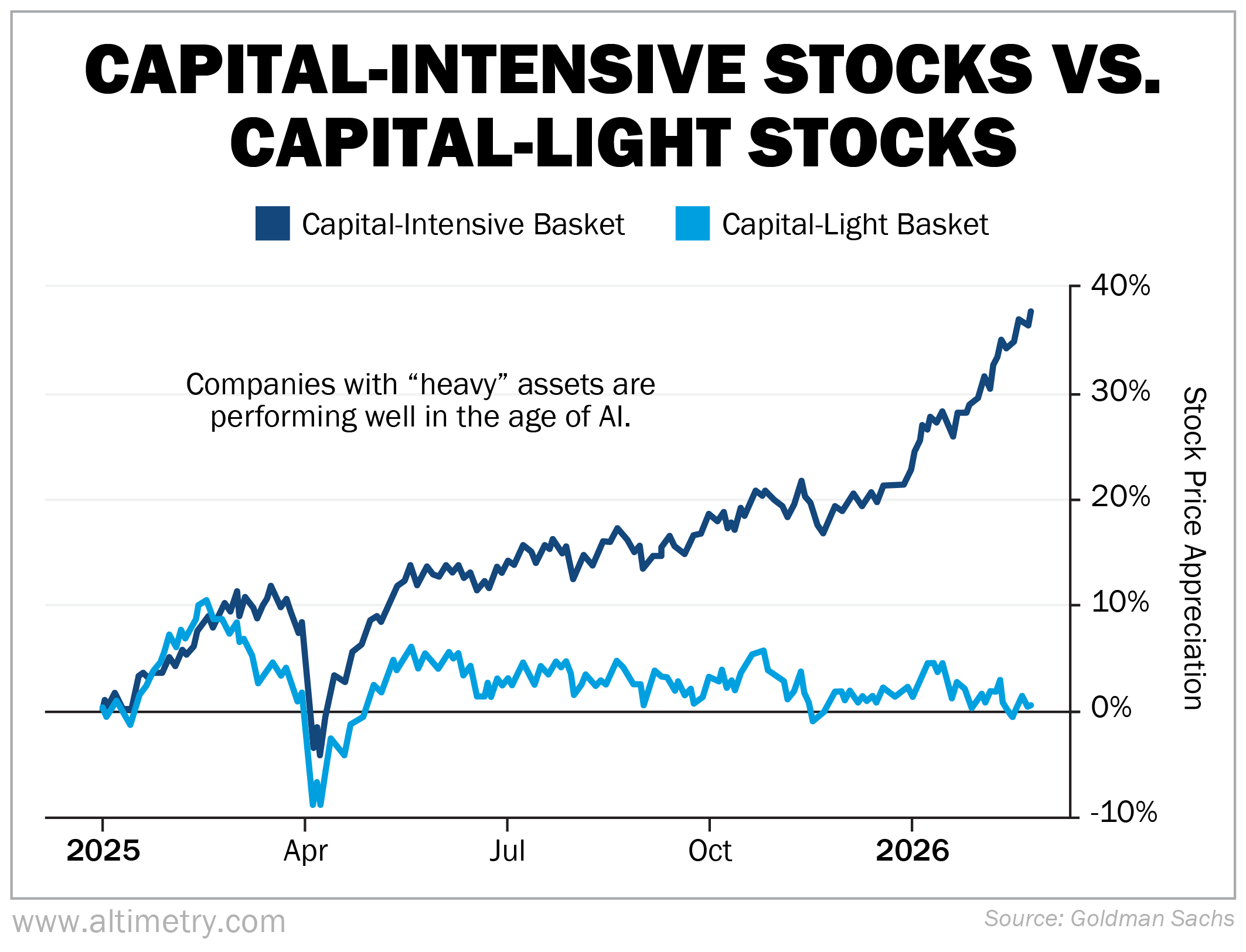 The capital-intensive batch has outperformed the capital-light group by about 35% since the start of 2025. Take a look...