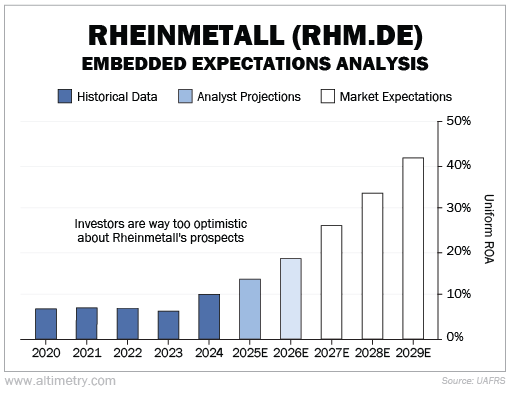 At current prices, investors see that Rheinmetall is becoming a key player in Europe's defense industry. The company's Uniform return on assets ("ROA") has been around 7% over the past five years... and the market expects it to surge above 30% as soon as 2028.