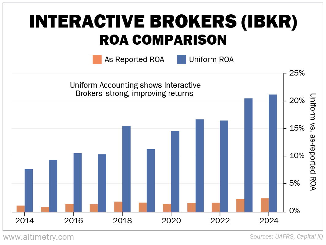 Interactive Brokers is far more profitable than investors realize. Uniform ROA has been above breakeven for the past decade.