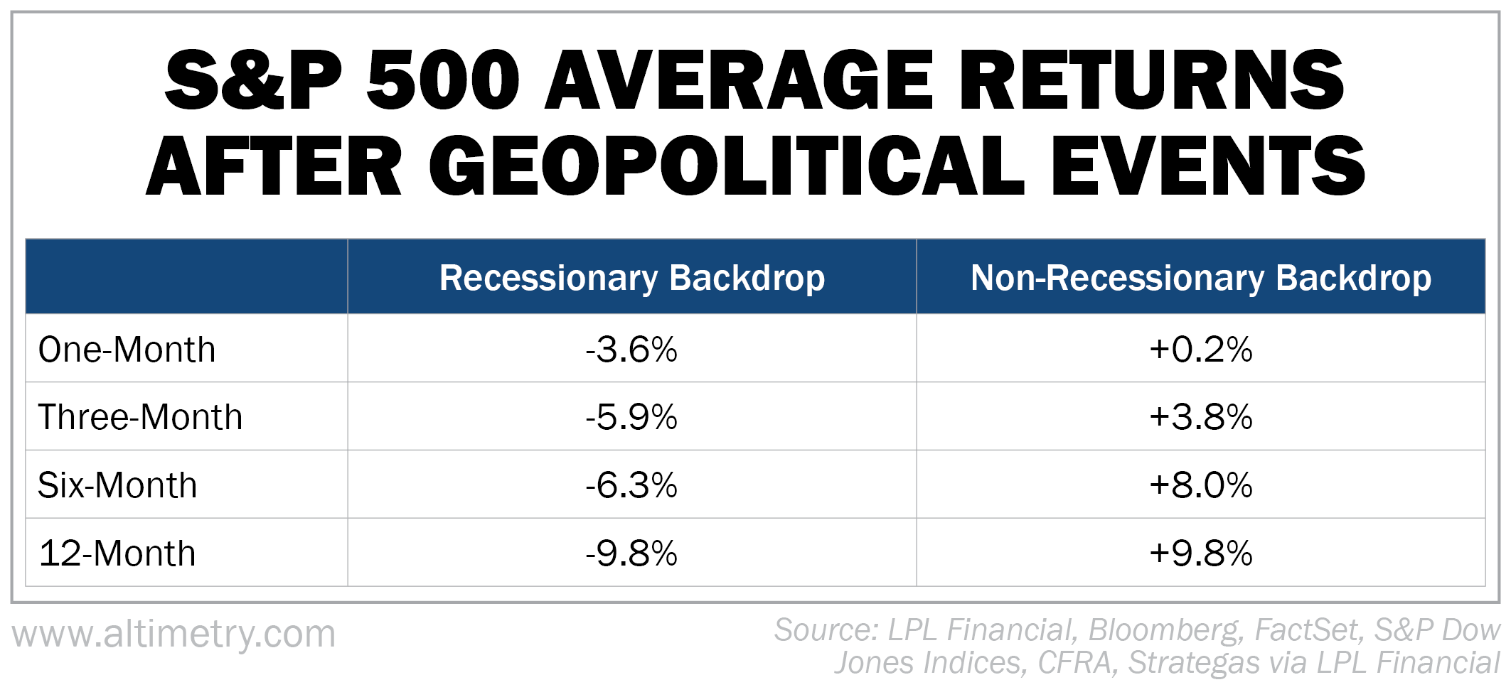 That's especially true when we look at geopolitical events that occurred nowhere near a recession, such as when the Israel-Hamas war started in October 2023.
