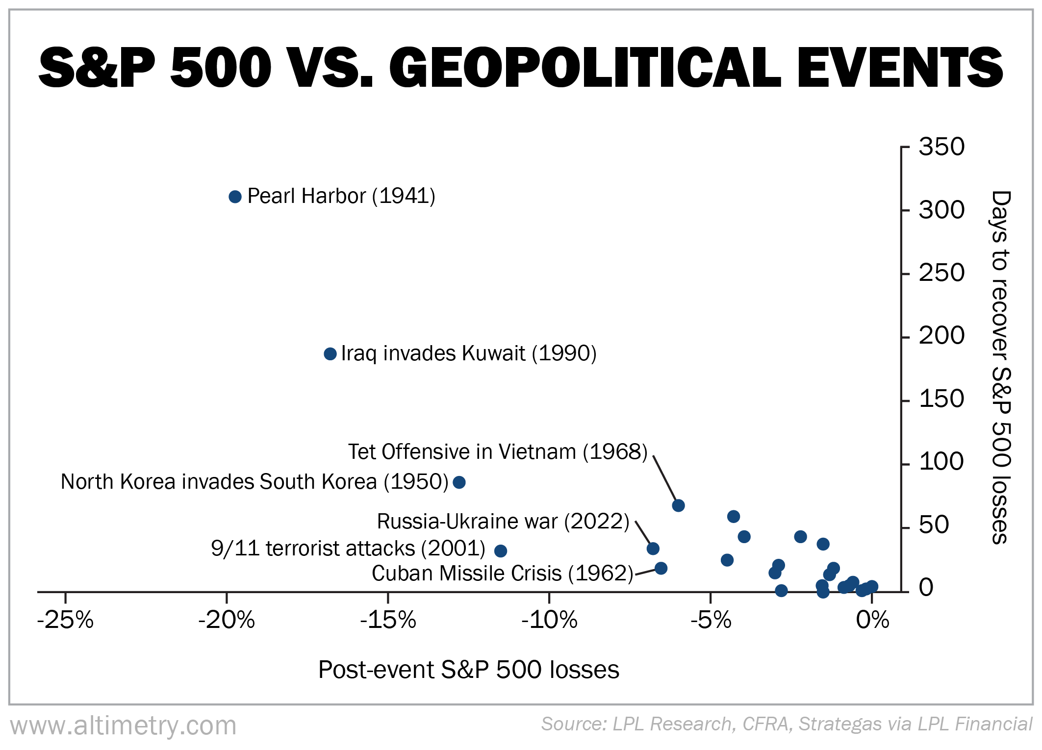 In the chart below, we can see how stocks have reacted to more than two dozen major geopolitical events since World War II.
