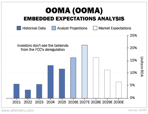 However, investors think Ooma's Uniform ROA will slip back to just 7% by 2030.