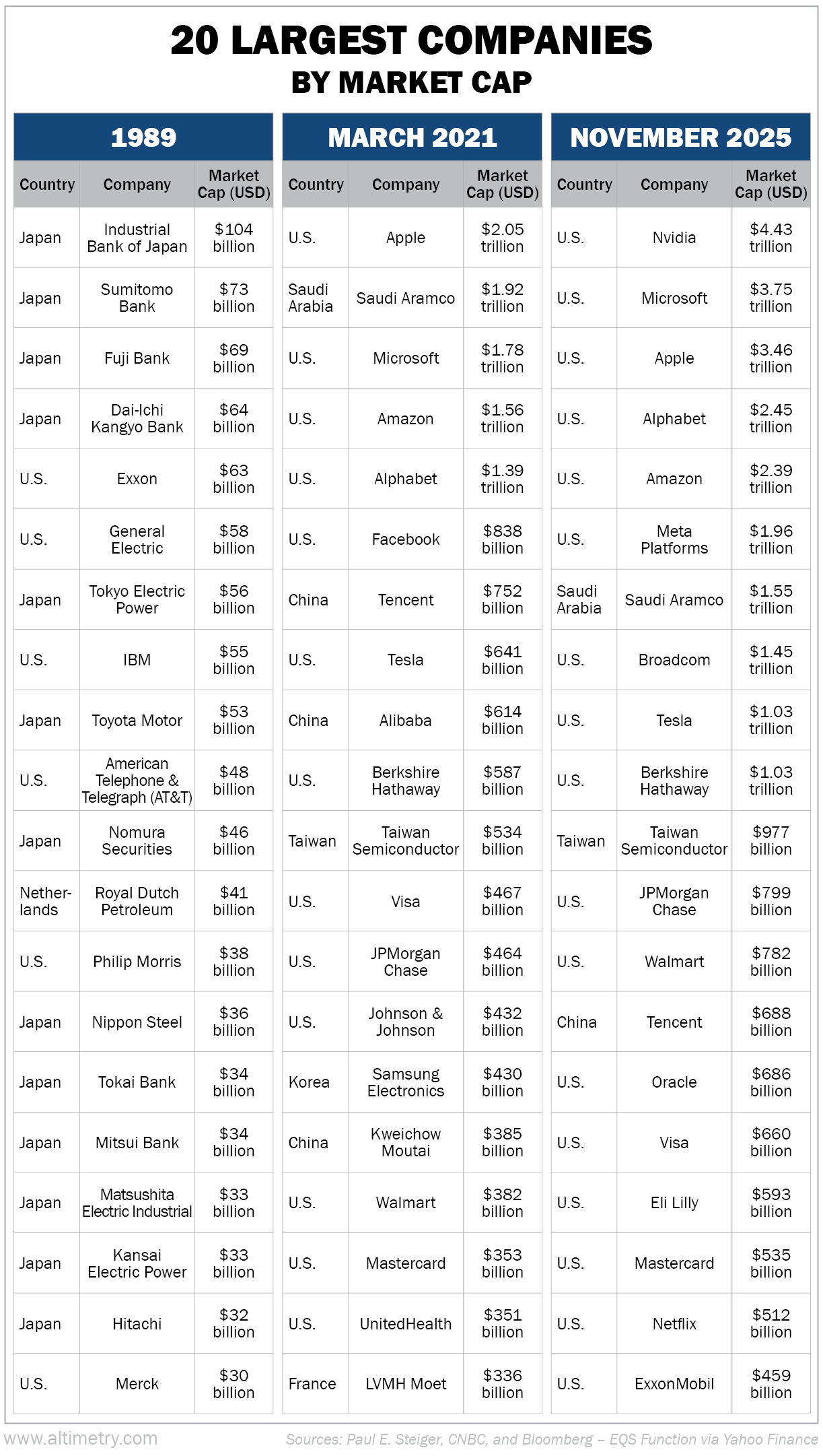 Take a look at the table below. It shows the top 20 global companies by market cap in 1989... 2021... and today.