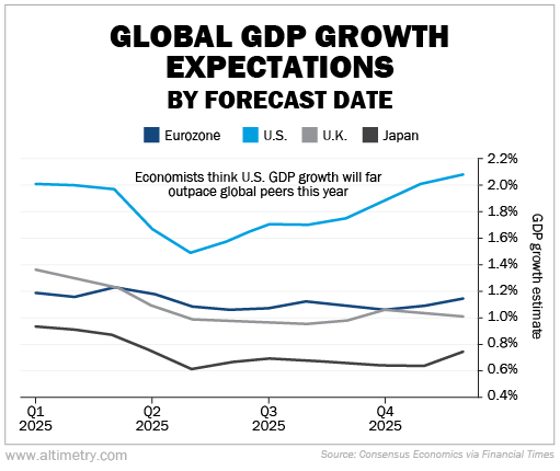 The U.S. is the region with the highest expected GDP growth, at more than 2%. It's also the only region with higher expectations as of the fourth quarter of 2025 versus the start of last year.