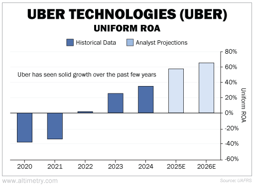 It took until 2023 for Uber to turn a profit. But since then, its Uniform return on assets ("ROA") has risen to 35%... nearly three times the corporate average. And over the next two years, it's expected to keep rising to 65%.