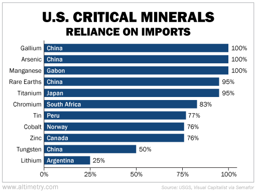 And even today, the U.S. still isn't in control of several critical materials. Certain minerals we need for semiconductors, like gallium and arsenic, are still 100% imported from China...
