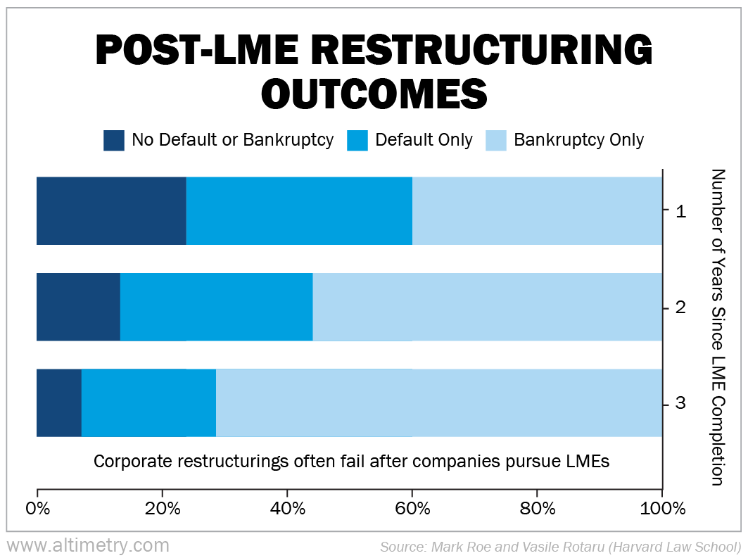 Within one year of completing an LME, roughly three-quarters of companies had a new default or bankruptcy filing.