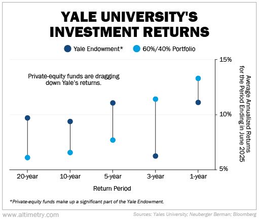 That equation has completely flipped today. Private markets are saturated, and higher interest rates persist. Simply put, private-equity funds (which make up most of the Yale Endowment) are finding it harder to produce big returns. Take a look...