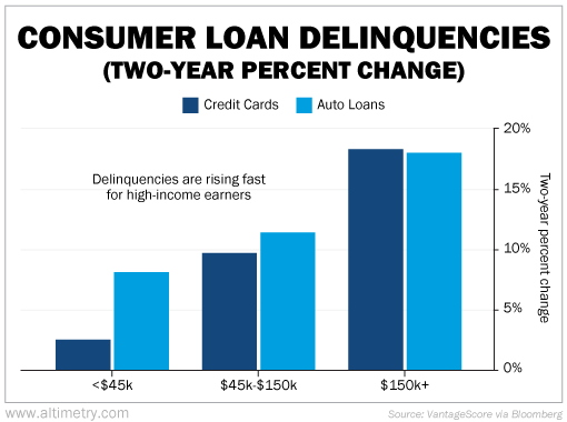 The stress on high-income earners is unusual... and worth watching. If debt levels start rising from here, it could signal deeper cracks in the economy.