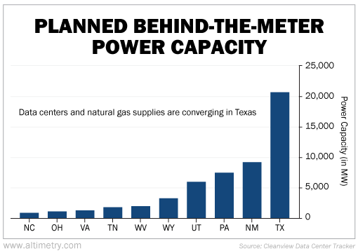 It helps that most of these data centers are popping up in America's natural gas hub... Texas. In fact, Texas has the biggest behind-the-meter capacity in the U.S. – at 20,695 MW. Take a look...